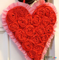 “爱之心”情人节/婚礼挂饰DIY,用皱纹纸做出很多红色玫瑰花,然后再将它们粘贴到心形硬纸板上,基本制作思路就是这么简单!